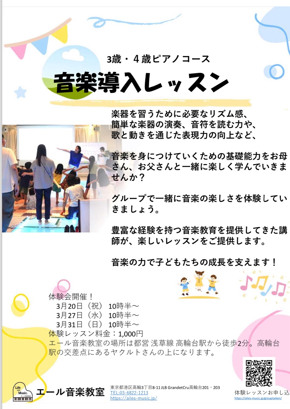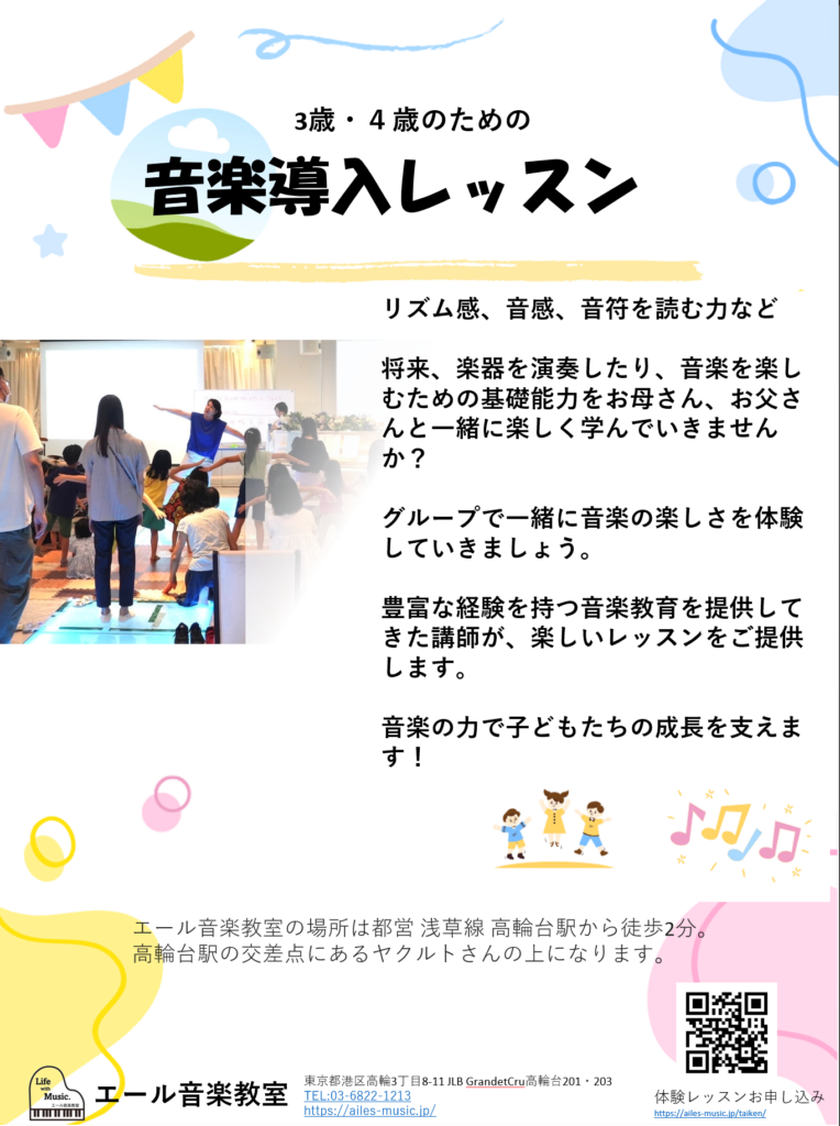 ピアノなどの楽器を習うために必要なリズム感、簡単な楽器の演奏、音符を読む力や、歌と動きを通じた表現力の向上など、これから音楽を身につけていくための基礎能力をお母さんと一緒に楽しく学んでいきませんか?