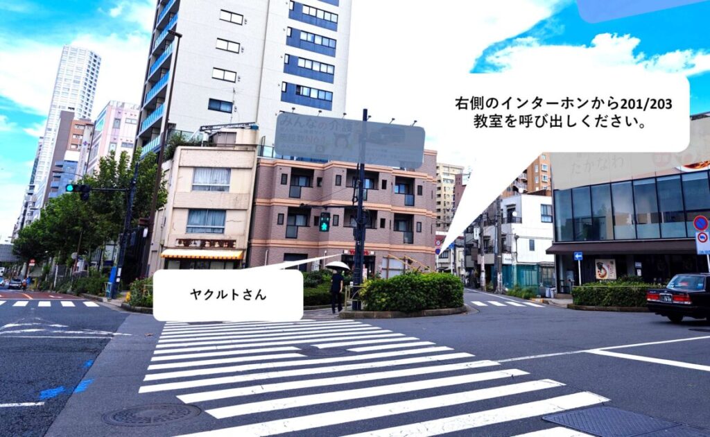 教室にいらっしゃる際には、建物の右手のインターホンから201/203号室を呼び出してください。